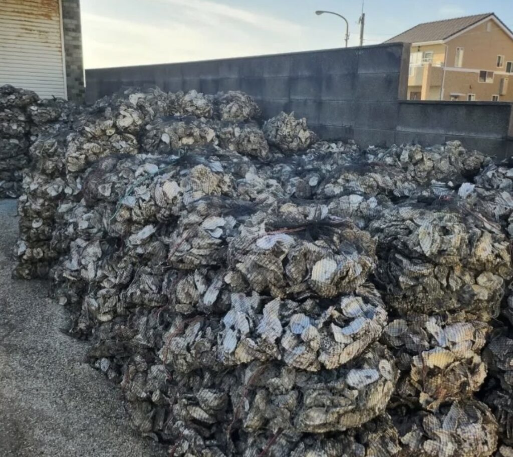 そこで目にしたのは、大量の牡蠣殻が雨ざらしになって保管されていました。